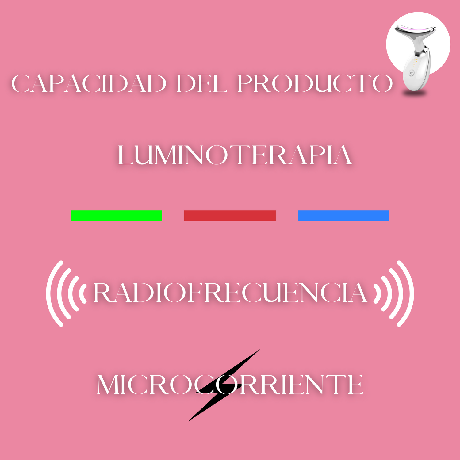 Luz roja: utilizada en el modo EMS, ayuda a estimular la producción de colágeno, mejorando el aspecto de las arrugas y líneas de expresión.
